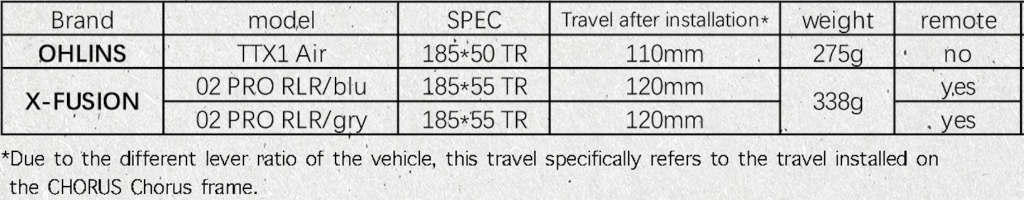 No Rear Suspension Included, OHLINS TTX1 Air 110mm ($699.00), X-Fushion O2 Pro RLR 120mm (Blue) ($299.00), X-Fushion O2 Pro RLR 120mm (Gray) ($299.00)